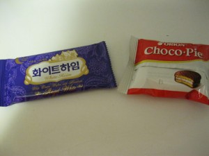 The purple package is a white chocolate wafer thing that is superb! and The “choco-pie” is just like a smaller version of our American Moon Pie! I was able to save them until I got to Orlando!