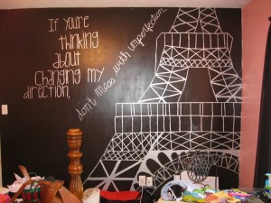 Another room that one of my sisters had was hot pink and lime green (We call it the Barney room!) So when my middle sister took over my old striped room, she chose the theme of PARIS! My sister is a great painter, she got the talent from my grandfather! So she painted her room pink, with an accent wall that is black with a saying and the Eiffel tower! I thought it would be fun to give you a full view of the bits and pieces you saw in my post {here}.
