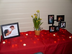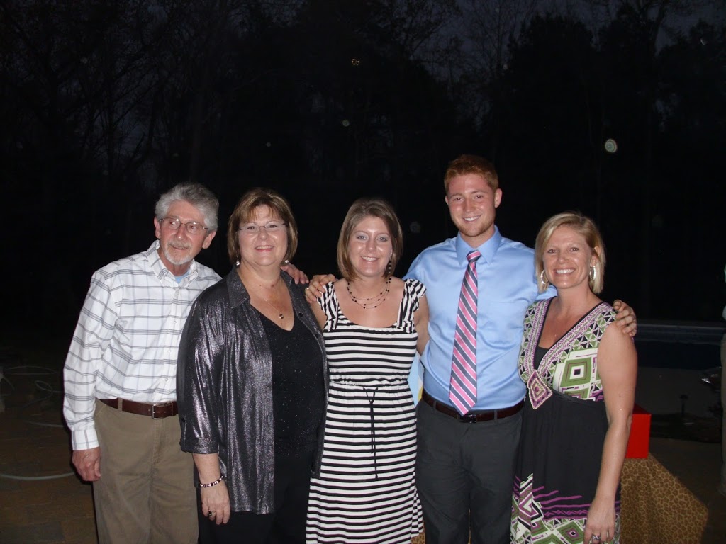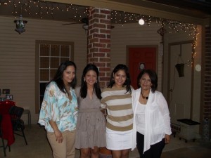 When I arrived back, I spent the rest of my time working my butt off getting ready for my best friends wedding shower. It was beautiful! We had white table cloths and bunched up red cloths in the center that had marbles and candles lit all down the middle of the tables. We had Chicken corn chowder and pork loin sandwiches. It was a great time to celebrate the love of friends! Here they are with their families! 🙂